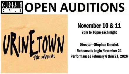 Open auditions will be held November 10 & 11. Full details with character breakdowns, sides, and more will be available soon by clicking here. Questions? Write info@curtaincallinc.com