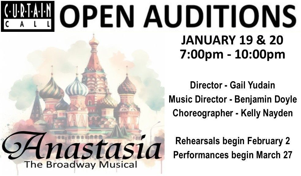 Open auditions will be held January 19 & 20. Full details with character breakdowns, sides, and more will be available soon by clicking here. Questions? Write info@curtaincallinc.com